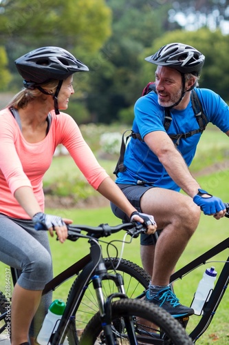© WavebreakMediaMicro, Naklejka premium Athletic couple looking face to face while riding bicycle