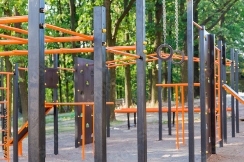 © An-T, Fototapeta premium Athletic equipment on outdoor workout area, closeup in selective focus