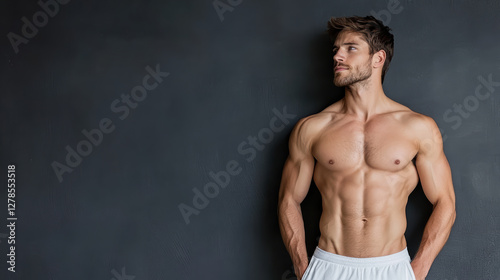 Fototapeta premium Athletic figure with six pack abs in bold pose against dark background