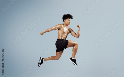 Obraz premium Athletic fit man sprinting and leaping forward on blue background