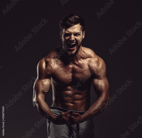 Fototapeta premium Athletic handsome man showing biceps muscles, studio shot