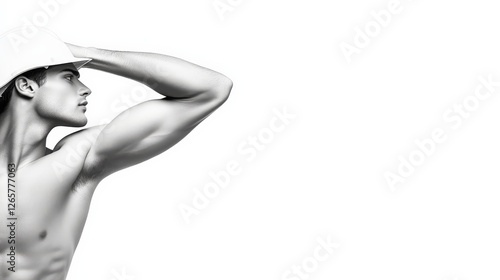 © KN Studio, Fototapeta premium Athletic Male Model in Hard Hat Posing with Strong Arm Flex