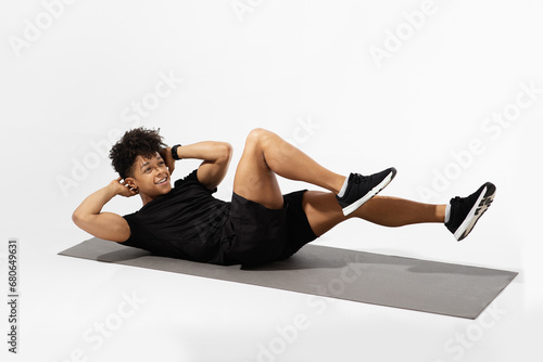 © Prostock-studio, Fototapeta premium Athletic man does elbow to knee crunches over white background