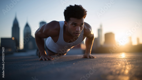 Naklejka premium Athletic man doing push-ups on a rooftop at sunrise with a city skyline in...