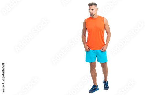 © be free, Fototapeta premium athletic man during a yoga class, advertisement. athletic man posed before sporty fitness competition. sporty athletic man in tshirt isolated on white. A standing athletic man at the gym studio