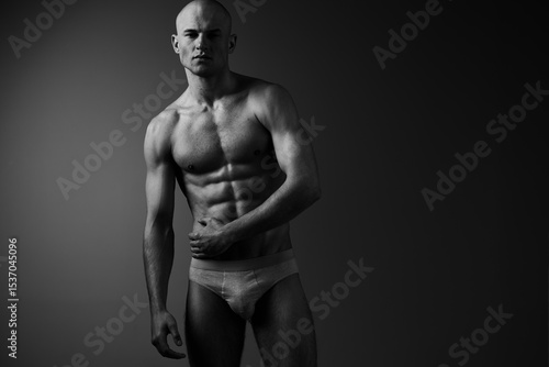 Fototapeta premium Athletic man posing in black and white photography, showcasing toned muscles and confident expression, focusing on strength and grace.