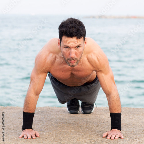 © Adam Gregor, Obraz premium Athletic man with upper body free making push-ups exercise