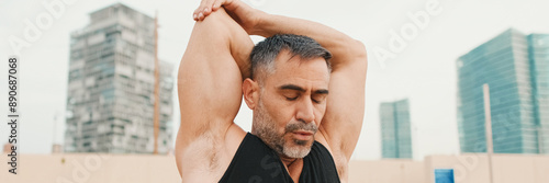 Fototapeta premium Athletic mature man stretches arm muscles while standing on the beach in the...