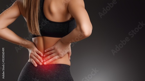 Fototapeta premium Athletic woman experiencing lower back pain, fit individual holding her back...