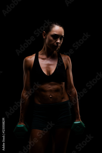 © Nikola Spasenoski, Fototapeta premium Athletic Woman Lifting Dumbbells in a Dark Background Highlighting Strength