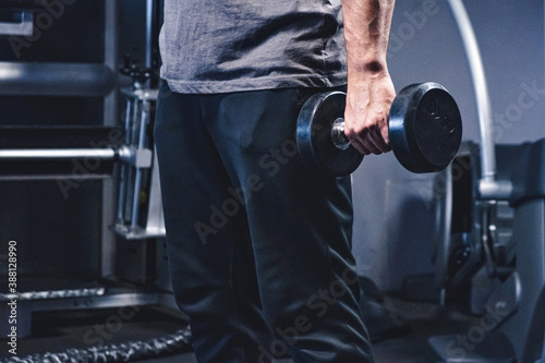 Naklejka premium Athletic young man workout in gym with dumbbells