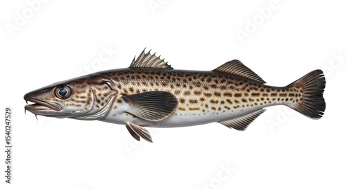Naklejka premium Atlantic Cod Portrait with Distinctive Mottled Pattern and Sharp Teeth on White Background