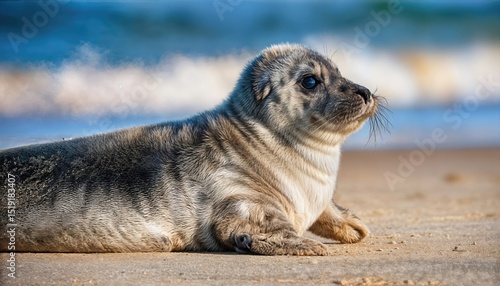 © netsay, Fototapeta premium Atlantic Grey Seal Pup Frolicking on Sandy Beach Playful Halichoerus Grypus Amidst Warm Coastal Hues and SunKissed Shoreline