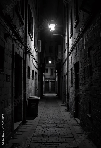 © Mehdi, Obraz premium Atmospheric Alleyway At Twilight. Cobblestone Path, Weathered Brick Buildings And Vintage Lamps Cast Stark Shadows. A Timeless, Quiet Urban Landscape. The Solitude Enhances The Moody Environment.