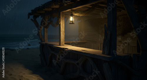 © Herlin, Fototapeta premium Atmospheric Beach Shack at Dusk with Glowing Lantern on a Rainy Night