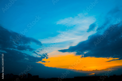 © Daniil, Naklejka premium Atmospheric blue cloudy sky behind silhouettes of city buildings. Cobalt and orange background of sunrise with dense clouds and bright yellow sunny light for copy space. Cyan heaven above clouds.