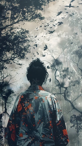 Fototapeta premium Atmospheric Chalk Art Landscape with Beech Trees and Crawling Beetles Amid Oversized Streetwear Fashion Silhouettes