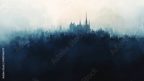 Naklejka premium Atmospheric cityscape panorama with ethereal mist enveloping urban silhouette