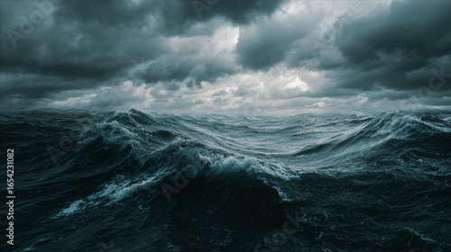 © darkbird, Fototapeta premium Atmospheric dramatic stormy sea with huge waves against cloudy sky