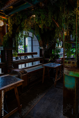 © Olga Mazo, Obraz premium Atmospheric industrial-style café corner in Tel Aviv, Israel, featuring rustic metal elements, hanging greenery, wooden tables, and a moody urban interior design perfect for background or life style