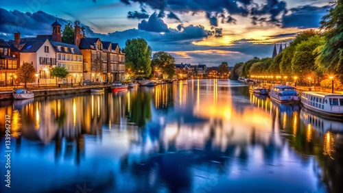 © Sirinporn, Fototapeta premium Atmospheric Low Light Thames River Kingston upon Thames Surrey England Night Photography
