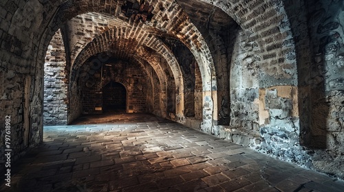 Naklejka premium Atmospheric medieval stone corridor with arched ceilings