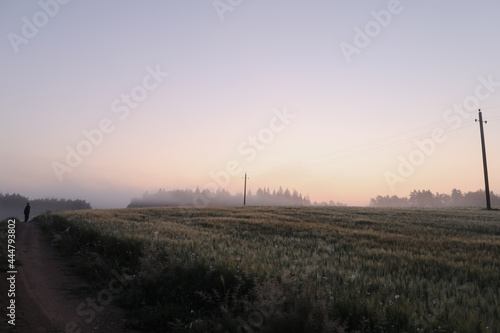 Fototapeta premium atmospheric misty meadow field and summer landscape at sunrise