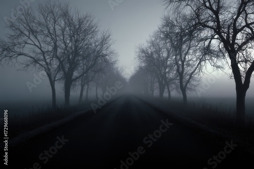 © Engineer Jahid, Fototapeta premium Atmospheric Misty Road, Bare Trees Silhouettes, Eerie Landscape, Moody Scenery
