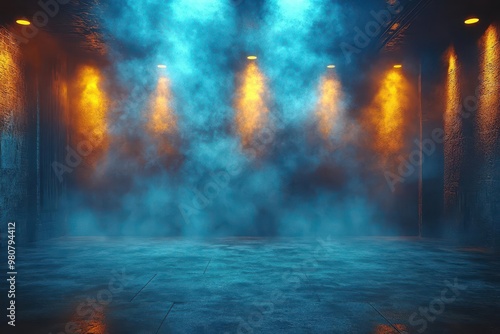 Fototapeta premium atmospheric nightclub stage vibrant blue and yellow lights piercing through hazy air empty anticipation