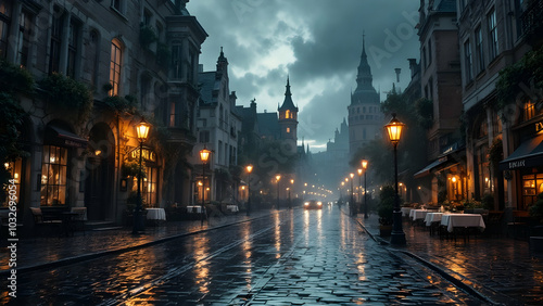 Fototapeta premium Atmospheric Rainy Street Scene at Dusk