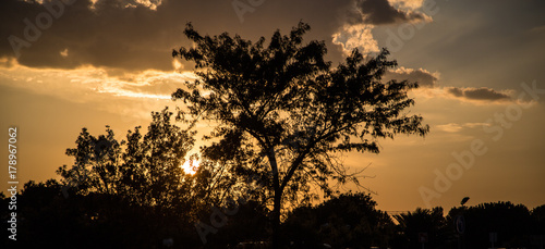 © Abambo, Fototapeta premium Atmospheric sunset with tree silhouettes in the foreground.