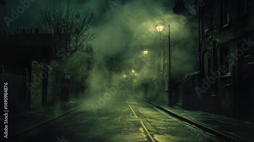 © dira, Naklejka premium Atmospheric urban scenery with eerie fog cascading through a dark road