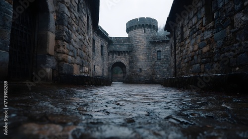 © Thares2020, Obraz premium Atmospheric view of a wet cobblestone path leading to an ancient stone castle gateway under an overcast sky