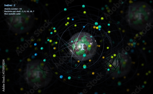 Obraz premium Atom of Iodine with detailed Core and its 53 Electrons with Atoms