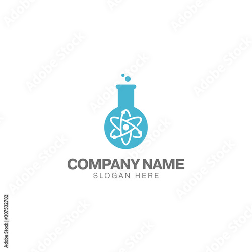 Obraz premium Atomic lab logo design template, lab bottle and atomic vector