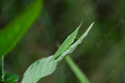 © ChairilAzmi, Naklejka premium Atractomorpha crenulata or tobacco grasshopper green insects live in many green plants resembling their bodies