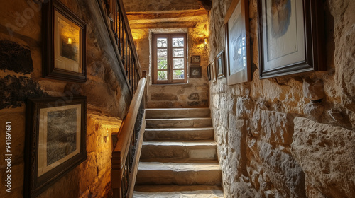 © Sawyer0, Obraz premium Atrakcyjna, rustykalna klatka schodowa w starym kamiennym budynku, oświetlona światłem naturalnym wpadającym przez małe okno, z wiekowymi ścianami.