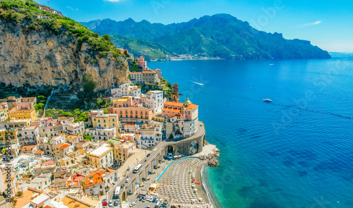 © Zedspider, Naklejka premium Atrani on Amalfi Coast, Italy. Aerial photo of famous city Atrani located on Amalfi Coast in Italy