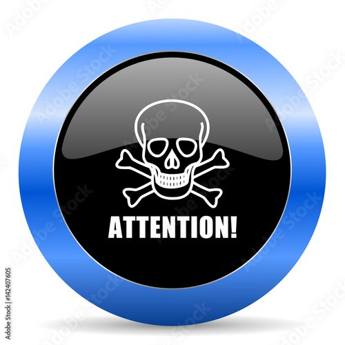 Fototapeta premium Attention skull black and blue web design round internet icon with shadow on...
