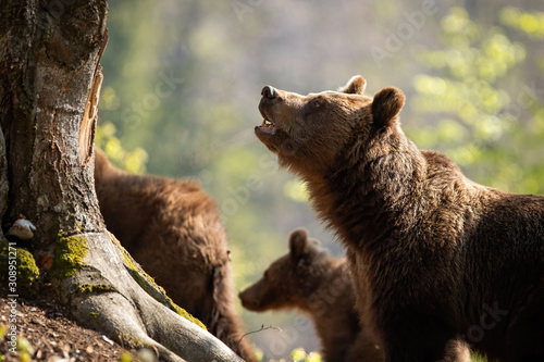 © WildMedia, Obraz premium Attentive female of brown bear, ursus arctos, with open mouth observing the surroundings and protecting her children. A massive forest animal feeling in danger. Dominant brown predator having a guard.