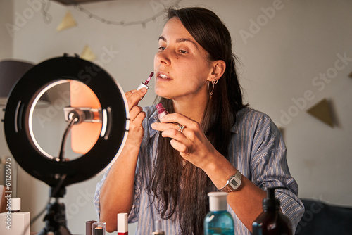 © Yakobchuk Olena, Fototapeta premium Attentive lady with long brunette hair making daily natural makeup and looking at smartphone camera