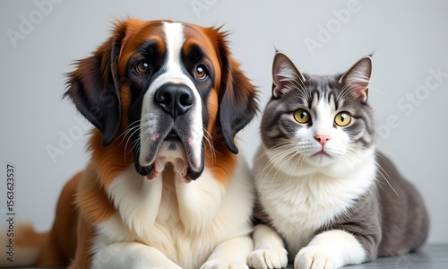 © Tatiana, Obraz premium Attentive Saint Bernard and Grey Cat in Intimate Portrait Against Light Grey Background