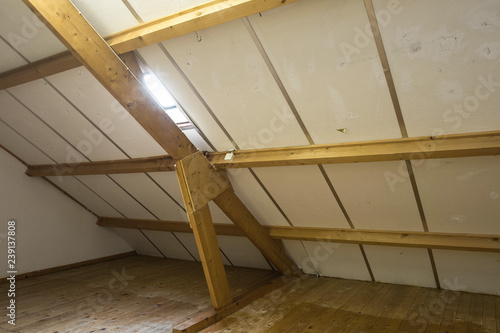 © annebel146, Obraz premium Attic, roof before construction with window and wooden beams