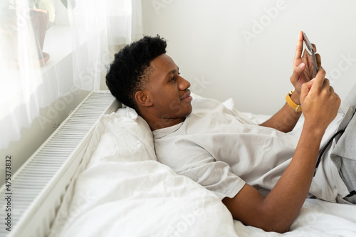 Fototapeta premium attractive african guy lies in bed with tablet