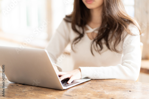 © taka, Naklejka premium attractive asian woman using laptop in living room