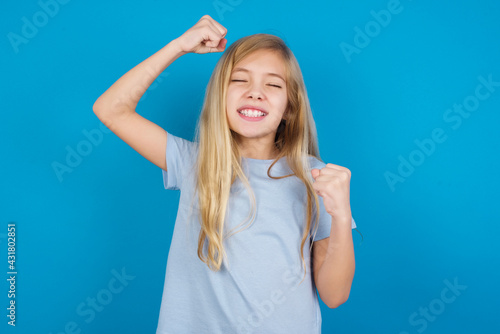 © Jihan, Fototapeta premium Attractive beautiful Caucasian little girl wearing blue T-shirt over blue background celebrating a victory punching the air with his fists and a beaming toothy smile.