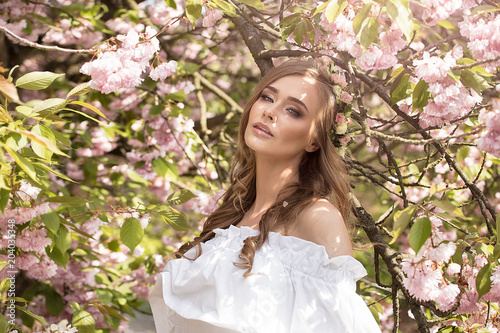Fototapeta premium Attractive blonde girl in blooming garden.