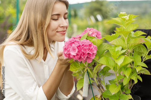 © Zoriana, Fototapeta premium Attractive blonde with eyes closed enjoying scent of blooming flower in greenhouse. Female customer in white shirt smiling and keeping pink hydrangea in hands. Concept of pleasure.