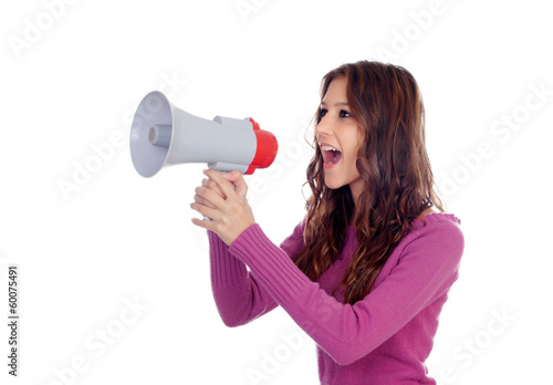 © Gelpi, Naklejka premium Attractive brunette girl shouting into a megaphone