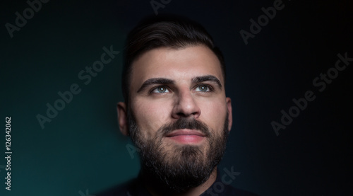 © Myvisuals, Fototapeta premium Attractive business man on dark studio background.